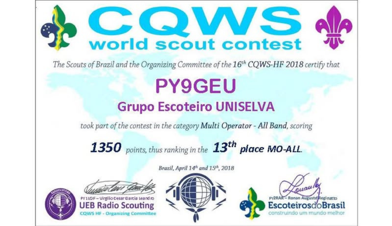 Parabéns ao 2º Grupo Escoteiro Uniselva/UFMT por alcançar a 13ª colocação nacional no 16º CQWS (Concurso de Radioescotismo Mundial)! Uma conquista que nos enche de orgulho e demonstra a força do escotismo mato-grossense quando aliado ao radioamadorismo.